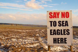 There have been several protests over the reintroduction the best publicised of which is pig farmer Mr. Jimmy Butler’s billboard which reads “Say No To Sea Eagles Here.”