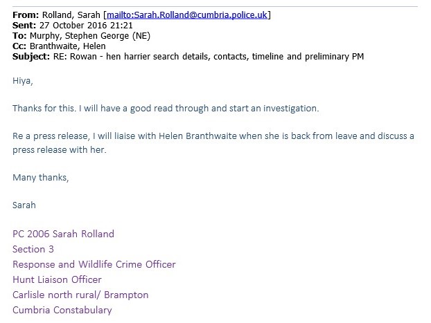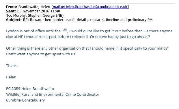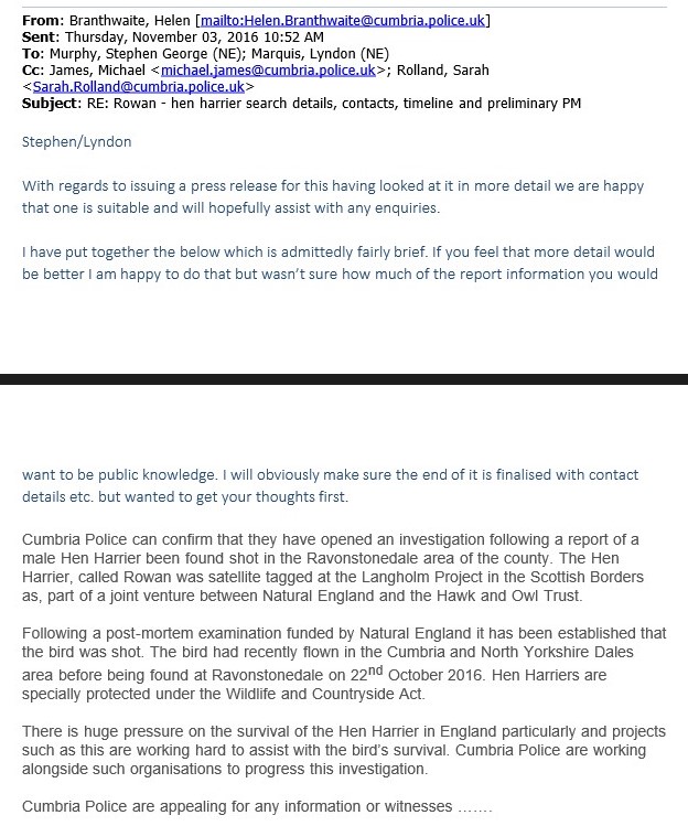 On 3 November 2016, WCO Helen Branthwaite of Cumbria Police sent a copy of a draft press statement about Rowan’s death to Natural England. Pay close attention to the wording of this draft police press statement, particularly the sentence, ‘Following a post mortem examination funded by Natural England it has been established that the bird was shot’: