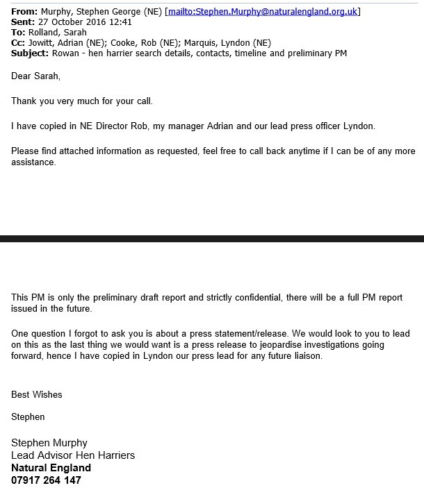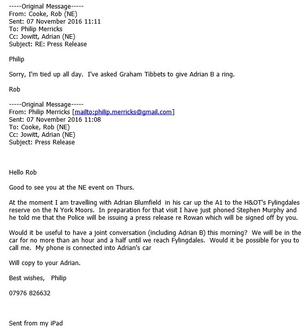 Four days later, on 7 November, Philip Merricks (Hawk & Owl Trust) wrote to Rob Cooke (Natural England) asking for a telephone conversation between Rob Cooke, Philip Merricks, Adrian Blumfield (Chief Operating Officer, Hawk & Owl Trust) to discuss the imminent Police press release about Rowan “which will be signed off by” Rob Cooke. Rob Cooke replied and said he would ask Graham Tibbetts (NE’s Head of Media) to make contact with Adrian Blumfield: