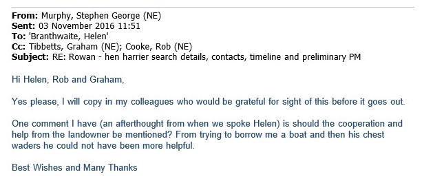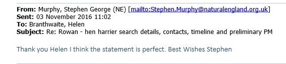It is apparent from the wording in Philip Merricks’ email that Rob Cooke (Natural England) was going to “sign off” the police press statement so did Natural England and the Hawk & Owl Trust collude to have this detail changed? It would certainly be in both their interests to have it changed because a ‘muddied’ ambiguous statement about a ‘likely shot’ hen harrier is far less damaging to their friends in the grouse shooting industry than a clear, evidence-based confirmatory statement that a hen harrier had been shot, especially at the time when driven grouse shooting and its associated criminality was being debated at Westminster.
