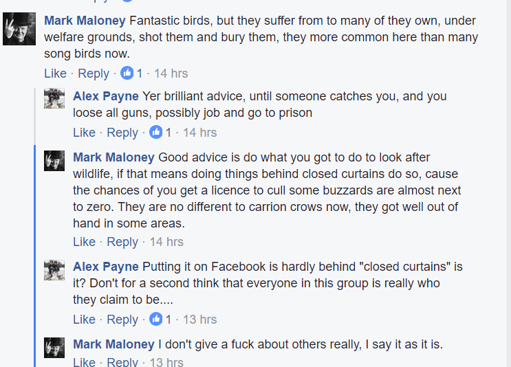 The following conversation took place on a Facebook page called ‘Gamekeeper chat’ on 12 February 2017. They were discussing buzzards:
