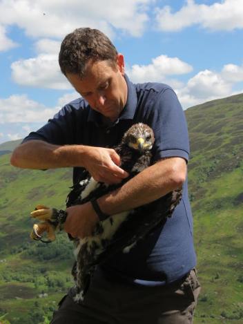 Another photograph that Bert has circulated was also taken at this site on the same day. It shows Duncan quite rightly checking the fit of the young eagle’s sat tag harness before the bird is put back in its nest.
