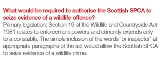 On this last point, the SSPCA has clarified that all that is needed is for the words ‘or inspector‘ to be inserted in appropriate places in Section 19 of the Wildlife & Countryside Act. That’s it. It’s not difficult, it’s not complex (as former Environment Minister Aileen McLeod claimed), it’s just two words that could make such a difference to the effectiveness of wildlife crime enforcement in Scotland, which, let’s face it, is currently appalling: