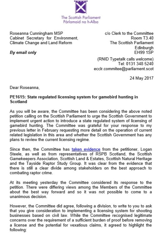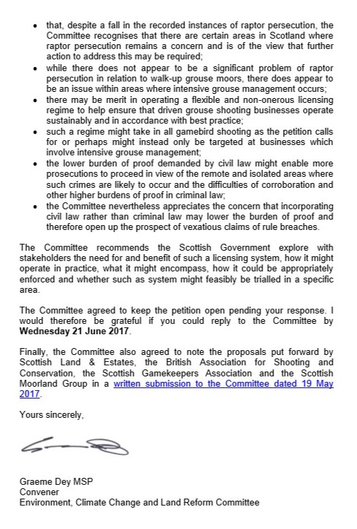 We have been disappointed at the muddled thinking behind the petition for a licensing system. Initially it was for all types of game shooting, but soon became clear that it was really another attack on driven grouse moors. The idea of licensing specific types of shoot management or parts of land holdings in multiple use has not been thought through either in terms of practicality, collateral impact, unintended consequences or even whether it would hit the target specifically identified by the Cabinet Secretary in her letter to the ECCLR Convenor of 7th March. The set of proposals put forward by our sector were to home in on the difficulty of evidence and enforcement which has been elusive. The solution to that is prevention, working with police, SNH and any other expert body such as RSPB and SRSG. A storm of media coverage is trying to put pressure on Government to implement yet more regulation but that is the wrong solution. To be clear we wholeheartedly believe that a combined strategy of punishment and prevention is the most effective way forward. This would be in keeping with the view of Police Scotland in relation to all forms of crime.