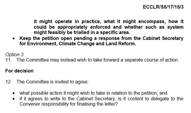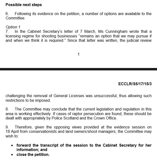 Given what’s happened since the Committee discussed this petition last month, i.e. Crown Office inexplicably abandoning three long-running prosecutions – alleged vicarious liability at Newlands Estate; alleged hen harrier shooting at Cabrach Estate; alleged pole-trapping offences at Brewlands Estate, and the witnessed shooting of a hen harrier at Leadhills Estate, the Committee will be hard pressed to justify taking option 1, because it is very clear that the current legislation and regulation is NOT working effectively.