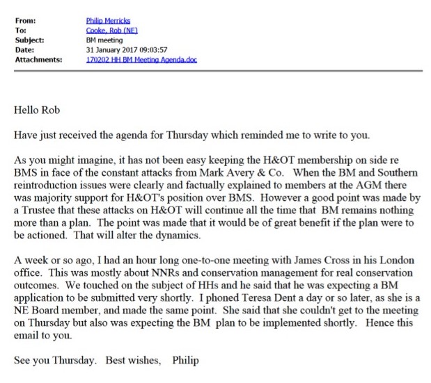 Apart from being amused at Philip’s delusional expectation that criticism of brood meddling will cease once brood meddling actually begins, the information contained within the second paragraph is actually quite useful. We presume James Cross is the same James Cross who is listed as the chief executive of Natural England – take note that at the end of January 2017, James Cross and Teresa Dent (GWCT) were anticipating the imminent submission of a ‘BM application’, which we assume is a brood meddling licence application (although of course we could be wrong). The relevance of this date will become clear in a minute….