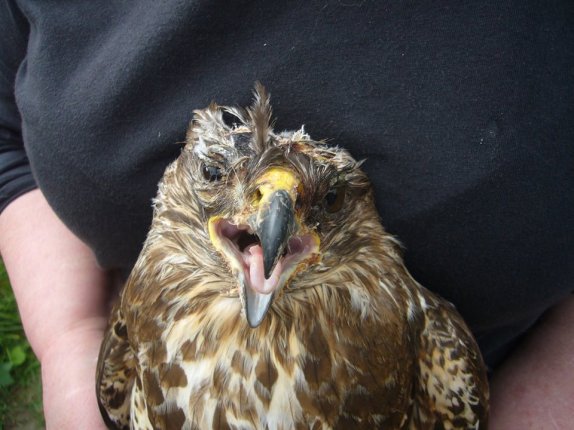 Last month we blogged about this adult female buzzard that had been found ‘down, shocked and injured’ in Norton, North Yorkshire. She has severe lacerations to her head and feet, believed to have been caused by trying to escape from a cage trap. An x-ray also revealed a shotgun pellet lodged on her right leg/foot. (Photos from Jean Thorpe)