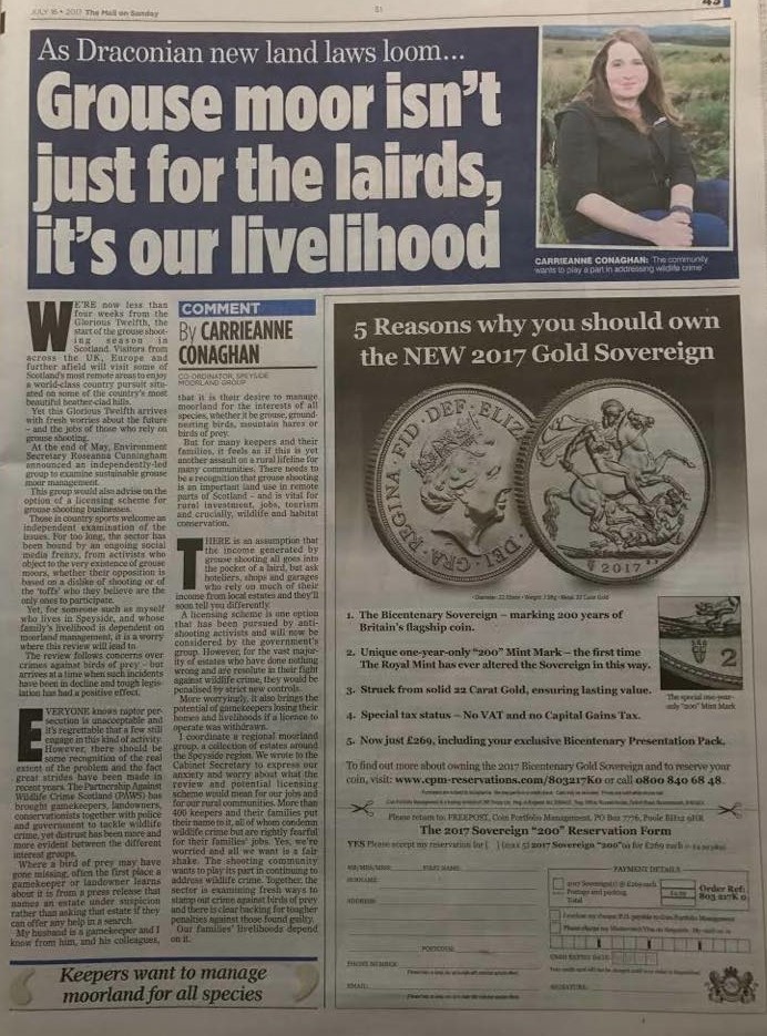 The second article was a commentary column written by Carrieanne Conaghan, a gamekeeper’s wife who coordinates the ‘Speyside Moorland Group’ – one of several regional moorland groups closely affiliated with the Gift of Grouse propaganda campaign.
