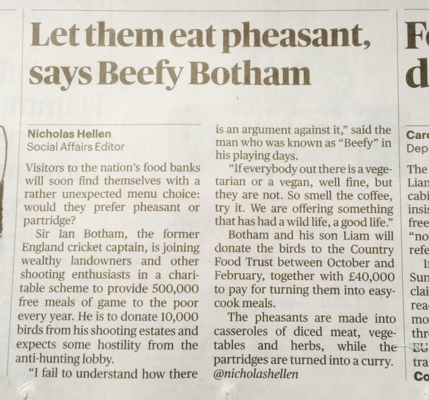 8. What a horrible human being! So, according to Ian Botham, he and his comfortably well-off pals are planning to alleviate the poverty of 14 MILLION people by “donating” £40,000 of their own money to feeding them surplus pheasants and partridges which they would otherwise be throwing into stink pits to snare foxes. £40,000 represents not much more than the average salary of ONE person in this country! And he has the cheek to harass the interviewer by demanding to know what she is going to do to alleviate the poverty problem. The guy is living in a pure fantasy world, and we can all see without any difficulty that he is simply pulling a cheap publicity stunt on behalf of the shooting community. And fallen flat on his face.