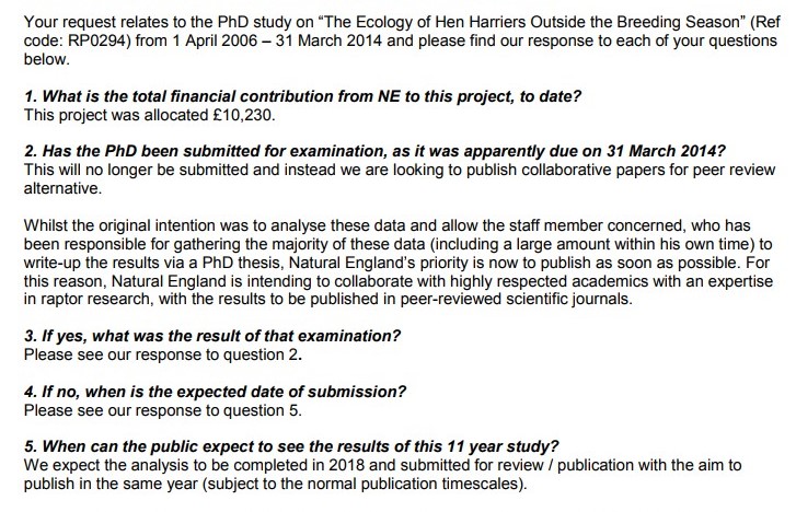 You’ll notice in the FoI response that NE says it is intending to collaborate with ‘highly respected academics with an expertise in raptor research’ to analyse the data and submit for peer-review in 2018. That’s fine, but depending on the choice of scientific journal, the quality of the research and the quality of the peer-review, this process can often take several years before a paper is finally published.