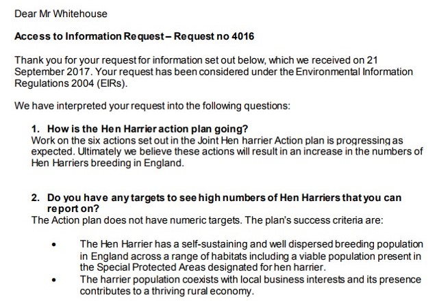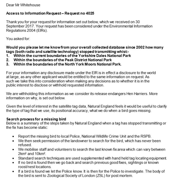 I have read your letter which by now, I assume, is a standard reply for anyone having the temerity to seek information from a public body such as yours. Some of us want to use the requested information constructively to help protect the Hen Harrier population in England. I wanted the information so that I could effectively lobby the 3 National Parks to get consolidated action to halt criminality on grouse moors. A laudable, if slightly ambitious aim.