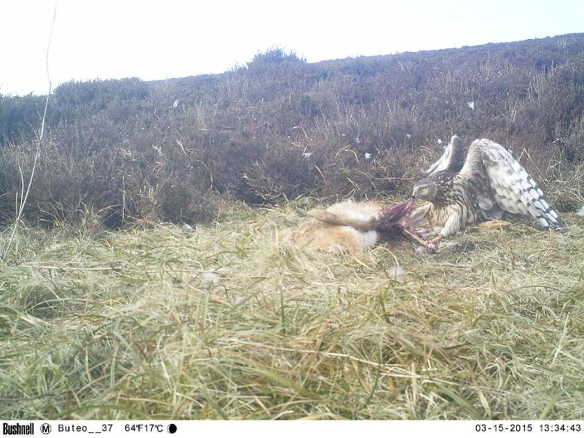 And what’s this about ‘hen harriers do not feed on carrion so the poisons map is not directly applicable to this species‘? Er, aren’t there records of hen harriers being killed by ingesting illegal poison? Yes, there most certainly are – see here. And what’s diversionary feeding if it isn’t the provision of dead food (i.e. carrion)? Of course hen harriers feed on carrion! And here’s a photograph of one doing exactly that, caught on a camera trap by SRSG member Stuart Williams in Orkney in 2015: