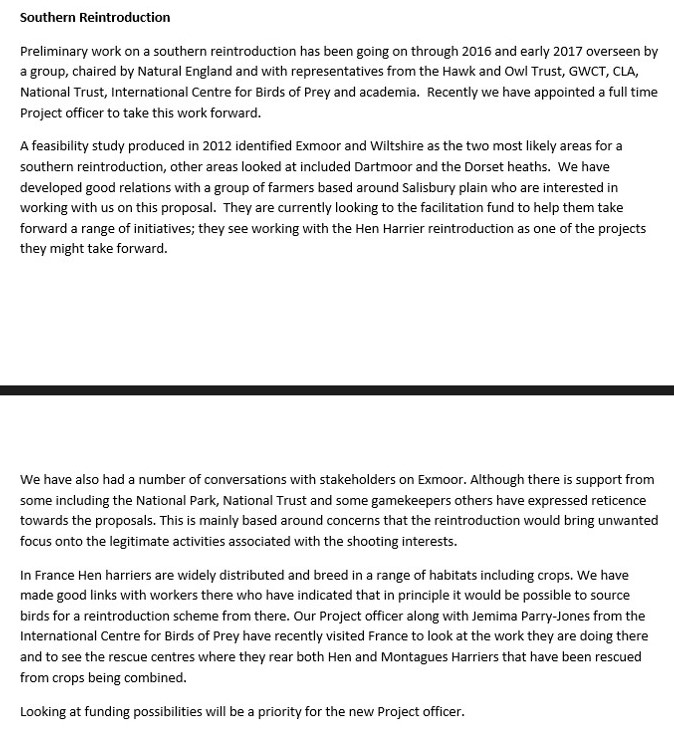 The [Hen Harrier] Action Plan was developed with senior representatives from organisations including Natural England, the Moorland Association, the National Gamekeepers’ Organisation, the Game & Wildlife Conservation Trust, National Parks England and formerly the RSPB. These organisations, led by Natural England, will monitor activities and report annually on progress to the Defra Uplands Stakeholder Forum and the UK Tasking and Co-ordinating group for Wildlife Crime’.