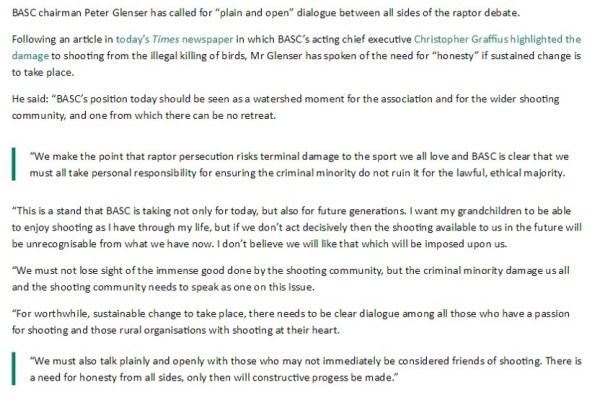 Christopher Graffius, acting chief executive of the British Association of Shooting & Conservation (BASC) has spoken out against the raptor killers within the shooting industry, according to an article in today’s edition of The Times.