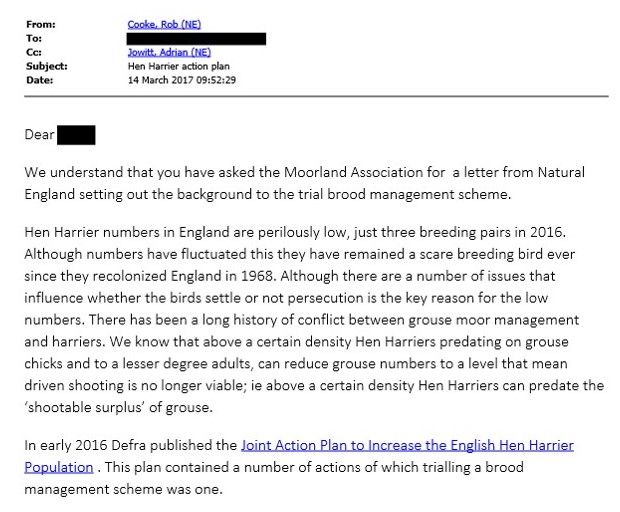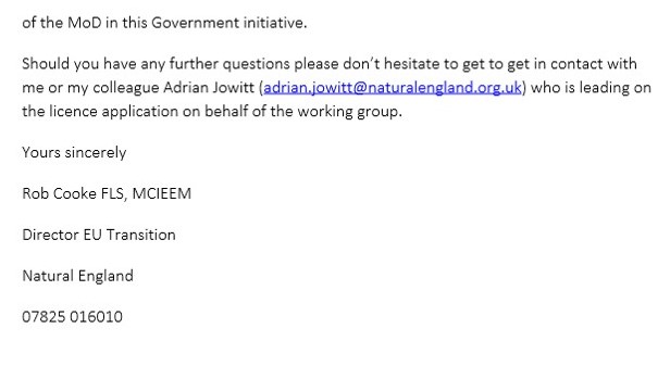 The only other bit of information that NE released as part of this “complex and voluminous” request was a couple of letters to the Ministry of Defence and to Yorkshire Water, inviting them to get on board with the hen harrier brood meddling plan. Here is a copy of the letter to the MoD (the letter to Yorkshire Water was virtually identical so we won’t reproduce it here):