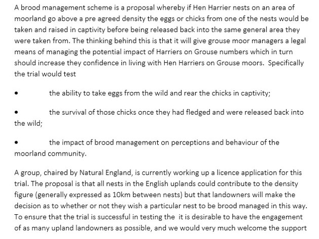 1. Indeed Francis. The whole plan is an admission by Government, DEFRA, NE you choose that persecution of Hen Harriers is out of control. They have little or no stomach to combat this crime or crimes in the usual way– bring the criminals to book and if current law does not suffice then change it.