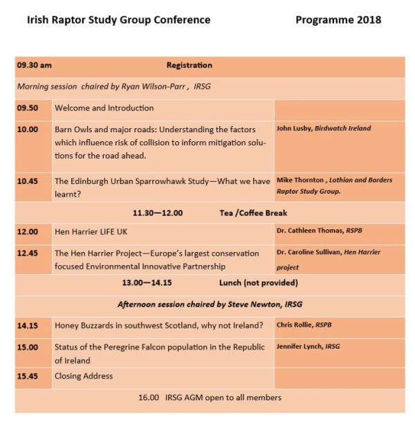 The Irish Raptor Study Group is hosting its 2018 annual conference on Saturday 27th January 2018, at The Green Isle Conference & Leisure Hotel in Dublin.