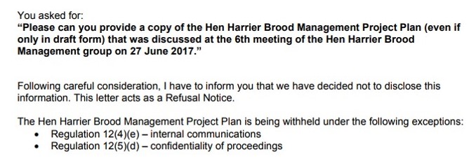 In many respects Natural England’s refusal to be upfront about anything to do with hen harriers will not come as a surprise to anybody. However, we were surprised at this particular refusal given that the draft brief for the proposed reintroduction of hen harriers to southern England HAS been released after several FoI attempts (see here).