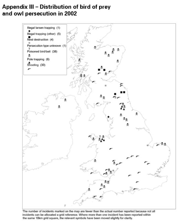 Here’s an example of a comprehensive raptor persecution map published 15 years ago by the RSPB in the 2002 RSPB Birdcrime report. This is the earliest Birdcrime report we could find online but there are also reports (and maps) that were published earlier than this.
