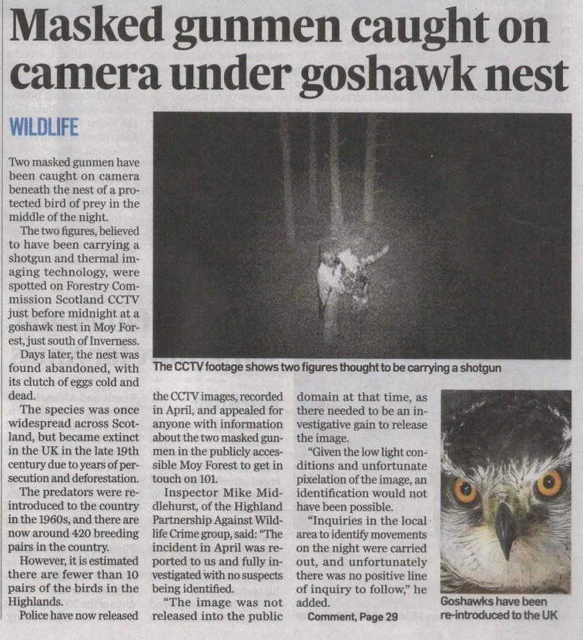 Unlikely to be any witnesses in the Moy Forest area after dark. Even if there was the people seen on camera near the goshawk nest are obviously local and know when to make their move i.e. when there are no FC rangers or members of the public about.