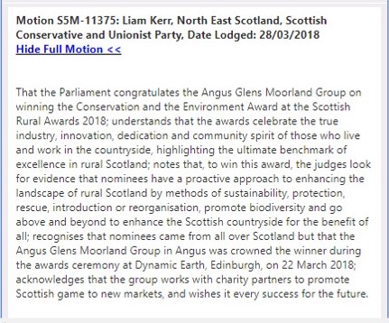 MSP Liam Kerr (Conservative, NE Scotland) is very proud of the group’s Conservation & Environment Award; so proud, he’s submitted a motion to the Scottish Parliament seeking congratulations and recognition for the group: