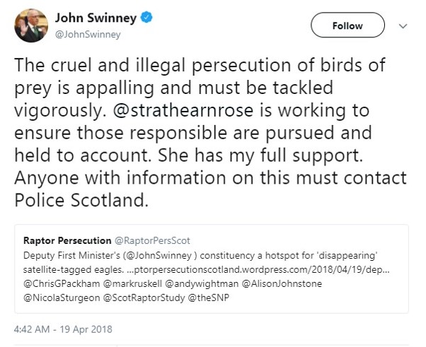 We have no idea of John Swinney’s views on illegal raptor persecution and its undisputed link to driven grouse moor management but as a respectable, law-abiding member of society we’d expect him to be as outraged as the rest of us.