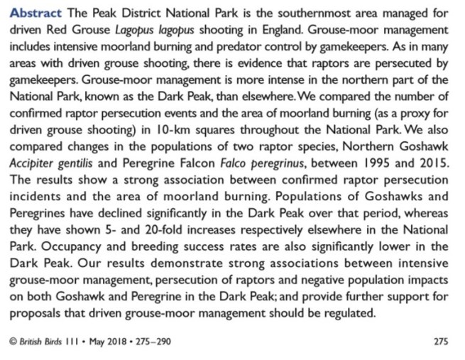 A new scientific, peer-reviewed paper, published in the journal British Birds, links the illegal killing of birds of prey with driven grouse moor management in the Dark Peak area of the Peak District National Park.