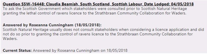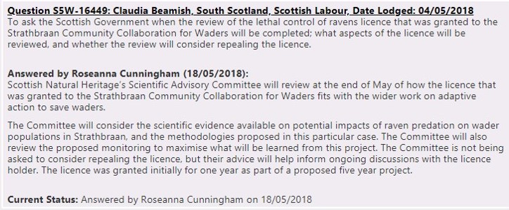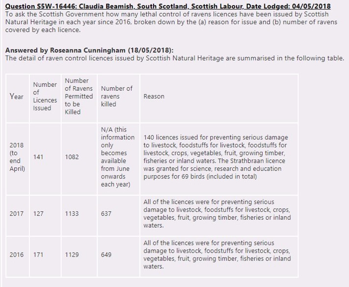 Earlier this month Claudia Beamish MSP (South Scotland, Labour) lodged a series of Parliamentary questions about the raven cull licence issued by SNH to a consortium of grouse shooting representatives, permitting the mass culling of ravens ‘just to see what happens’.