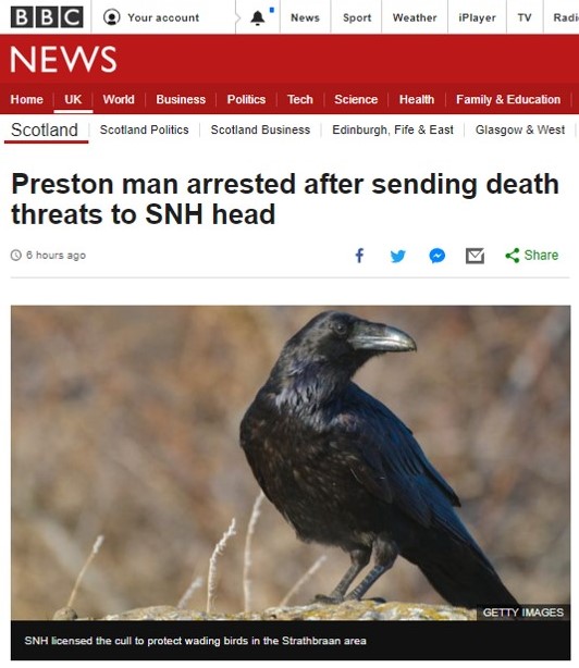 The BBC News website is reporting that a 47 year old man from Preston has been arrested and given a formal ‘harassment warning’ following an alleged death threat sent to SNH Chair Mike Cantlay over the controversial Strathbraan raven cull licence.