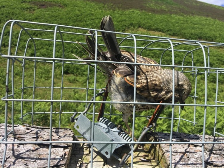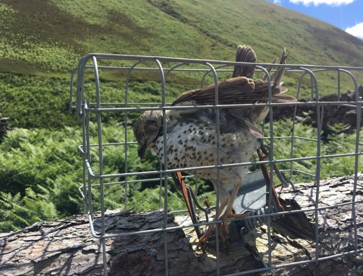 The traps ‘appear’ to be lawfully set (i.e. the spring trap has been set within a natural or artificial tunnel and the entry/exit is tapered to restrict access to non-target species), although clearly not restricted enough to prevent this mistle thrush getting in. The rules about what makes a trap lawfully or unlawfully set are notoriously vague – sometimes its obvious (e.g. if the trap is set in the open) but often it isn’t clear at all.