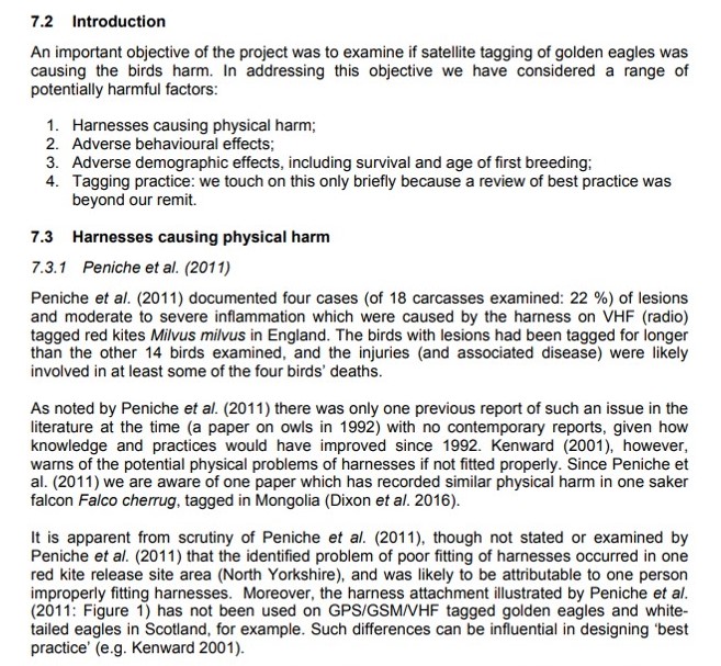 You see, what the Honorary Professors have failed to notice (or have chosen to deliberately exclude from their argument) is that the paper by Peniche et al (2011) detailing the lesions found on the tagged red kites was considered in great detail in the Golden Eagle Satellite Tag Review, as part of the authors’ assessment on whether satellite tagging was causing harm to golden eagles (Chapter 7). Here’s what they found: