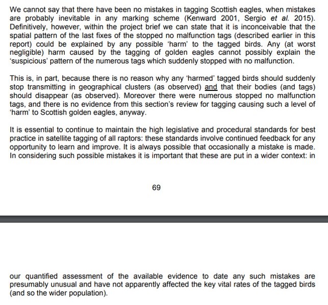 We’ll finish with this, taken from the end of Chapter 7 of the Golden Eagle Satellite Tag Review, that points out that even if tagging is harmful to golden eagles (which it hasn’t been proven to be), it still doesn’t explain the geographic clustering of all those ‘missing’ sat tagged eagles that just happen to coincide with areas of land intensively managed for driven grouse shooting, including, er the grouse moors of the Angus Glens: