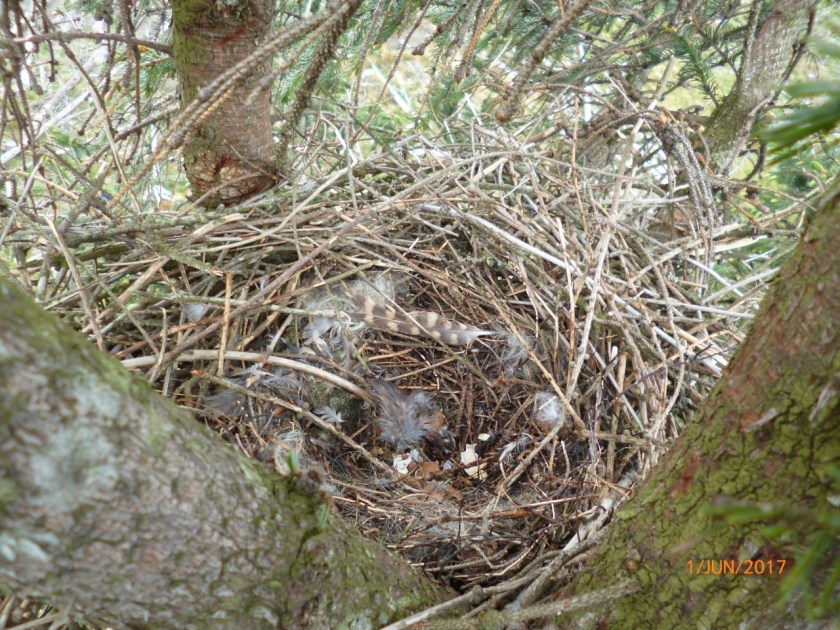 However, in this case the fresh damage marks to the tree branches and the presence of pieces of bark in the nest cup were indicative that this nest had been blasted with a shotgun while the nest was being used by a protected species, the merlin.