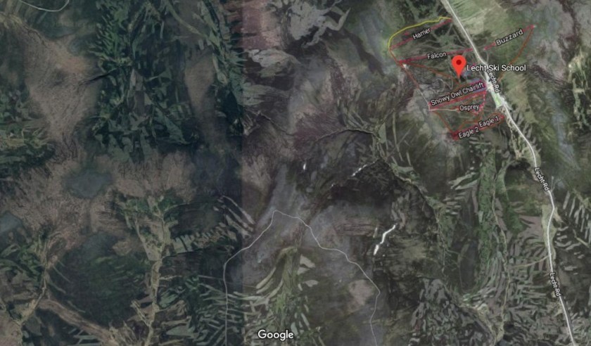 As you can see from this zoomed in map, the RSPB’s description doesn’t narrow it down very much as the area to the SW of the ski school is pretty much all driven grouse moor. It’s not like there is an isolated patch of grouse moor that stands out from the wider landscape that would be easy for us to pinpoint: