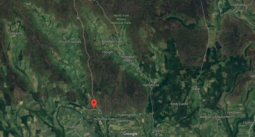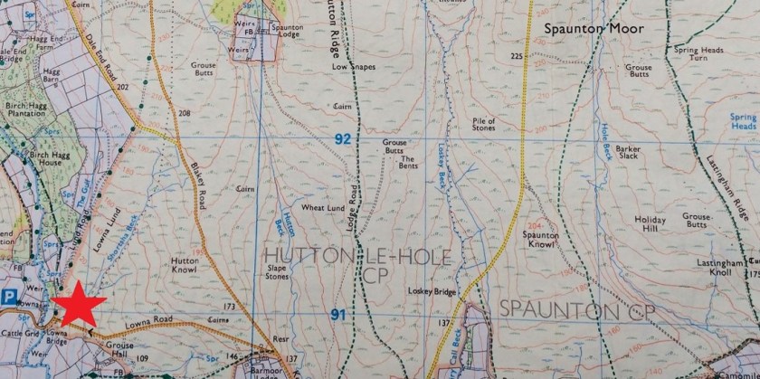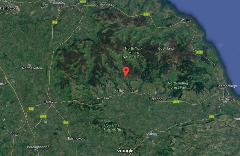 [RPUK maps showing approximate last known location of Hen harrier Arthur in the North York Moors National Park, close to Spaunton Moor, owned by George Winn-Darley, the North York Moors representative for the Moorland Association. Red star denotes Lowna Bridge]