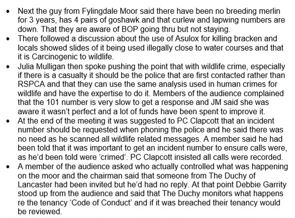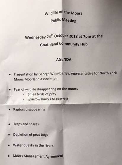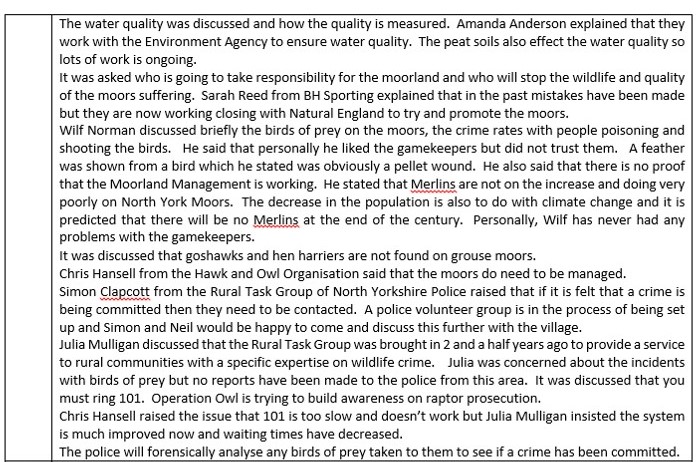 Here’s the agenda for the meeting held on 24 October 2018. We note with some irony the third item listed was ‘Raptors disappearing’. Less than two days after this meeting, the satellite tag attached to hen harrier Arthur sent its last signal from a grouse moor in the North York National Park before both it and Arthur ‘disappeared’.