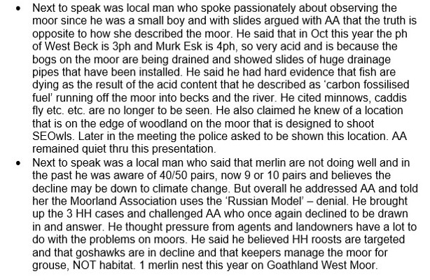 I live in Goathland and was the guy who challenged Amanda’s claims at the meeting. I can confirm the strength of local feeling here against the grouse estates. I don’t remember saying I have no problem with keepers. What I did say was that, with a couple of exceptions, I like them as blokes but don’t trust them an inch where large raptors are concerned. At one point I held up a Buzzard feather with clearly evident shotgun pellet damage and informed George Winn-Darley present, that I had picked it up on one of the local moors he manages last May. In fairness, I must point out that habitat management, ideal for waders and Merlins, (as well as grouse), on two moors at least in the National Park, is excellent – one being Spaunton Moor – owned by George WD – the other, Egton High Moor owned by Oliver Foster. Frankly, I cannot say the same for some of the highest moors in the NP which have been badly overburnt in recent years. You will be pleased to know that the two chaps who determinedly brought about the meeting have no intention of letting matters rest there. Be assured there will be other meetings so it is very much in the interests of the estates to get their act together and improve things significantly on their side of things if they want to avoid future local hostility and damaging publicity.