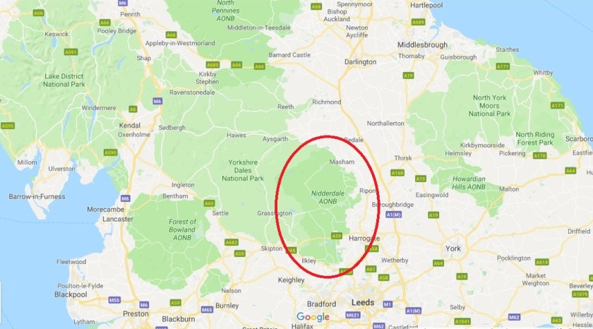 [Google map showing location of Nidderdale Area of Outstanding Natural Beauty (AONB) in North Yorkshire]