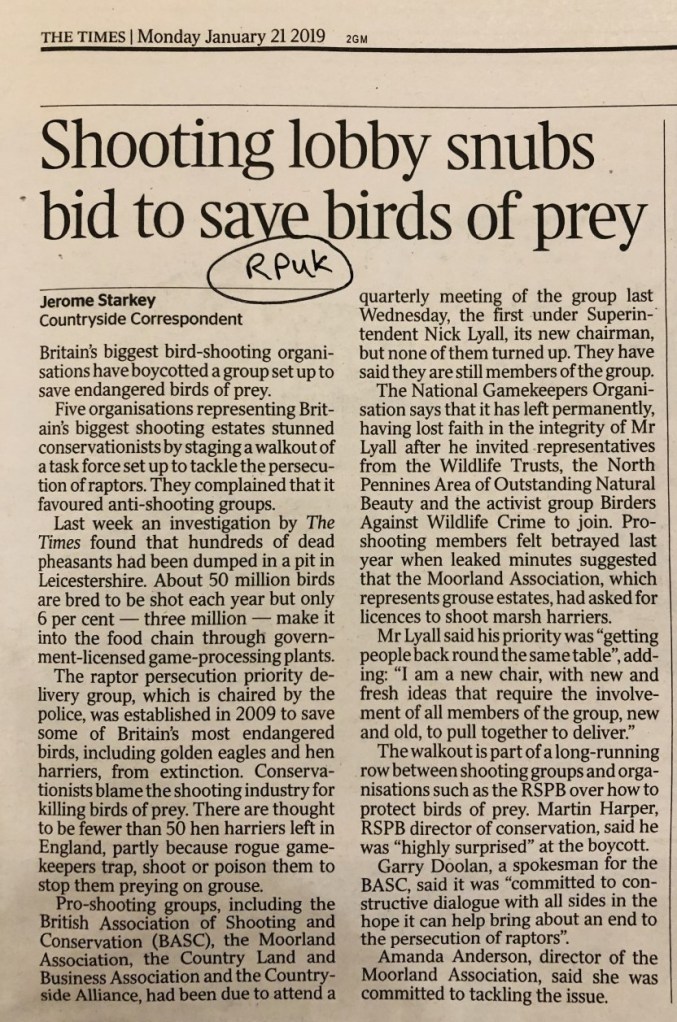 Further to yesterday’s blog (here) where it was revealed the National Gamekeepers’ Organisation had formally resigned from the DEFRA group established to tackle illegal raptor persecution (the RPPDG – Raptor Persecution Priority Delivery Group), there’s a piece in today’s edition of The Times explaining the gamekeepers’ decision, and also explaining why some of the other game-shooting organisations had boycotted last Wednesday’s RPPDG meeting. It has to be read to be believed: