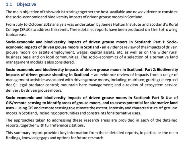 1. I think it just means exactly what it says, and full conclusions even for some of the questions which could be asked are available without huge effort. The employment figures gave an indication of the likely poor economic basis, and other pointers as to the biodiversity issues are there. I’m sure however that the Revive coalition report ‘Back to Life: Visions for Alternative Futures for Scotland’s Grouse Moors’ had the correct answer, even if the full scientific answer may well take 200 years.