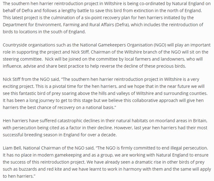 Remind us again, NGO – where was the last known location of the latest hen harrier to ‘disappear’ in suspicious circumstances? Ah yes, in Wiltshire, close to the proposed hen harrier reintroduction site and in an area heavily managed for pheasant and partridge shooting. And what did the NGO say about this bird’s disappearance? Ah yes, that it was “a set up” by the RSPB.