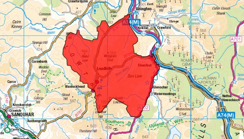 [RPUK map showing the boundary of the Leadhills Estate and its proximity to Elvanfoot. Map data from Andy Wightman’s Who Owns Scotland website]