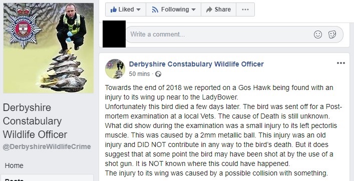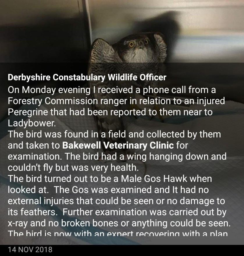 The bird, initially mistaken as a peregrine, was first reported injured by a Derbyshire Police Wildlife Crime Officer on social media in November 2018: