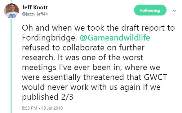 GWCT is apparently supportive of this approach to ‘science’ (ahem) as despite making three complaints about what we view as Gilruth’s deceptive behaviour, (two complaints directly to Chief Exec Teresa Dent and one complaint to GWCT’s general email account) all of them went unanswered.