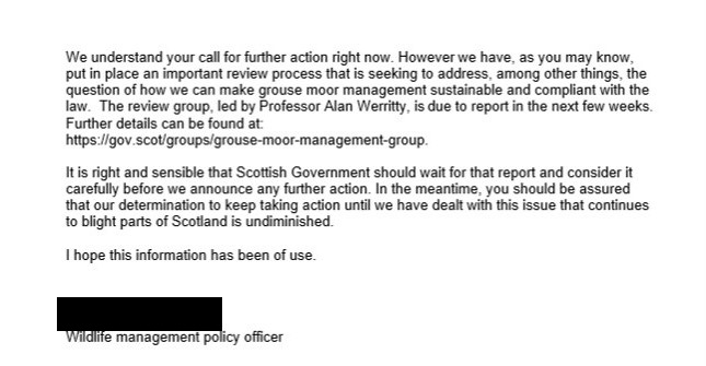 What an astonishing statement. Essentially that reads that grouse moor management is currently incompatible with the law, i.e.an illegal activity, and they are not prepared to do anything about until they have reviewed how they make it become legal.
