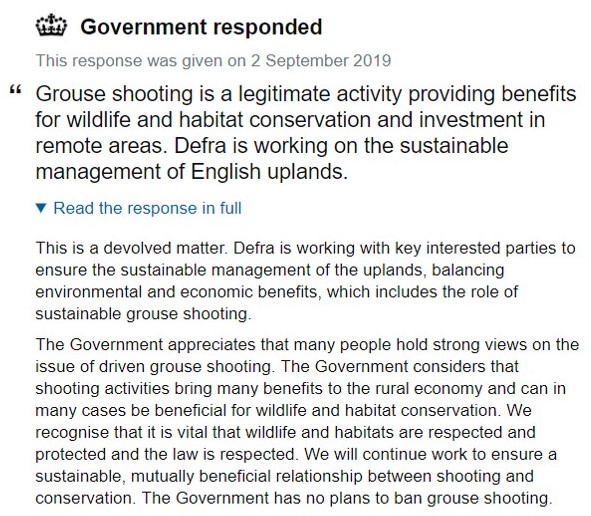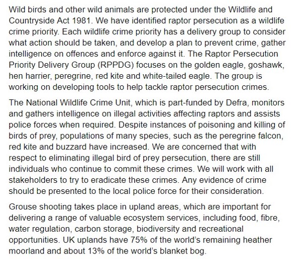 It’s very noticeable that this response statement only mentions driven grouse shooting once. The rest of the time DEFRA refers either to ‘grouse shooting’, ‘shooting activities’, ‘shooting’, and ‘game bird shooting’. This inconsistency can be expected when sentences have been copied and pasted from so many different sources, but it makes it look like DEFRA isn’t paying attention or, more likely, that it simply can’t be arsed and, crucially, misses the point that the petition focuses on driven grouse shooting, not the other types of grouse shooting which, arguably, are far more sustainable, certainly in relation to current management practices for driven grouse shooting.