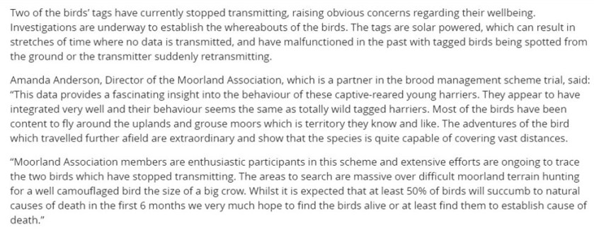 So far, so predictable, although I was wondering if MA members would be watching live transmissions to assist with making sure that these 5 birds survive on grouse moors. That doesn’t seem to have happened. Let’s remind ourselves that it is still September, and 40% have vanished no trace. I think we need another letter from the partners if any are to reach Xmas, never mind adding to the breeding stock.