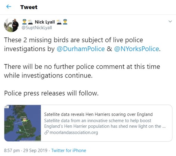 UPDATE 4 October 2019: Brood meddled hen harrier chick vanished from grouse moor on Bowes Estate, County Durham (here)