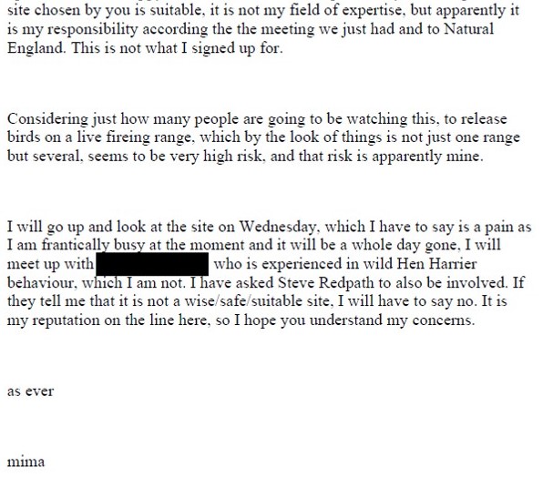 Jemima Parry Jones, a member of the project team and the person responsible for the captive rearing stage of the brood meddling trial, was the first (and only?) member of the team to raise concerns about releasing the birds on to a live firing range as she was worried about her reputation if it all went wrong: