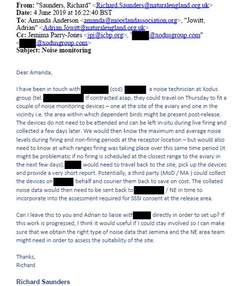 On the same day, Richard Saunders (NE’s Principal Advisor) sent around this email discussing the possibility of conducting noise monitoring at the live firing range in an attempt to appease Parry Jones’s concerns: